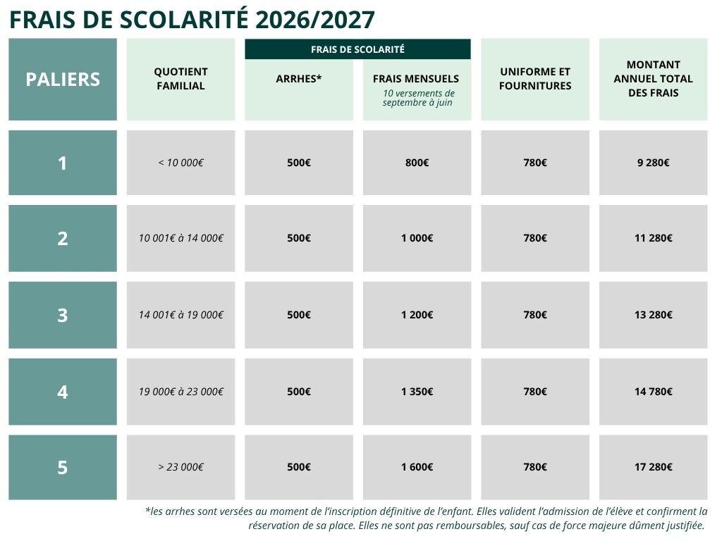 Afin de garantir l’accessibilité à tous, notre établissement applique une tarification progressive des frais de scolarité et d’internat. Ces tarifs sont adaptés en fonction du niveau de revenu des familles, selon un barème basé sur le Quotient Familial ou coefficient fiscal déclaré aux impôts (à ne pas confondre avec le Quotient Familial de la CAF)