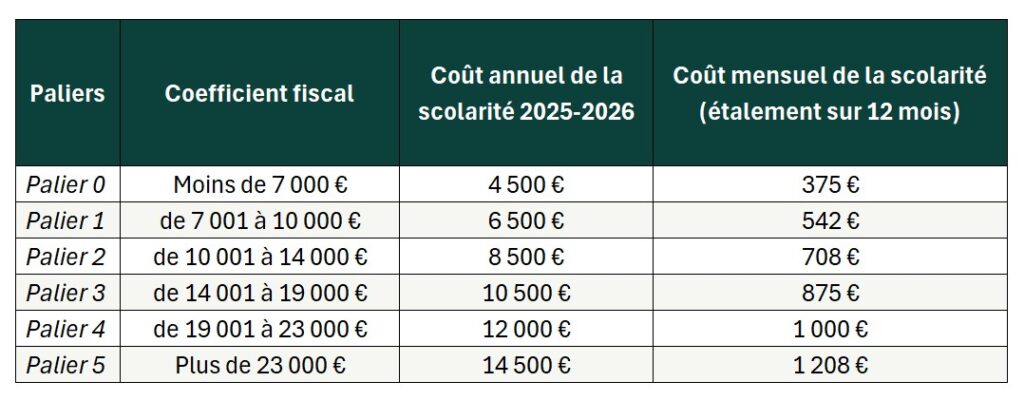 Le coût mensuel pour un élève commence à partir de 375 euros par mois (étalement sur 12 mois).